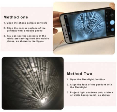 - Apresenta a mensagem “I love you” em 100 idiomas, gravada com o método de nano micro entalhe. Pode ver através de todas as lentes de câmara/smartphone padrão. Projete o coração central num fundo preto com a lanterna da câmara para mostrar o seu amor.
