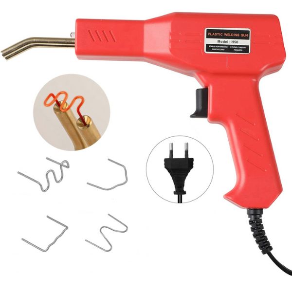 Para além da ferramenta de soldadura, a embalagem inclui também um alicate, uma faca e 200 agrafos de vários tamanhos numa prática bolsa. Estes agrafos foram concebidos para serem duráveis e resistentes ao calor e à água, garantindo uma longa vida útil.