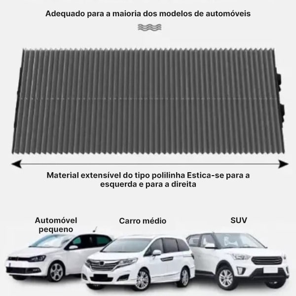 Este para-sol foi projetado para se ajustar a uma ampla gama de veículos, incluindo carros, vans, caminhões e SUVs. É um ajuste universal porque pode simplesmente cortar a largura na medida desejada.