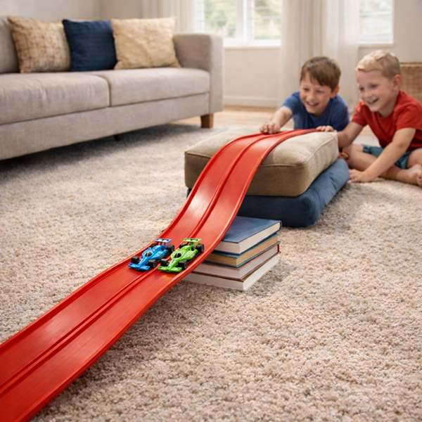 As crianças podem moldar a pista usando objetos do dia a dia para criar saltos, túneis e loops, incentivando a imaginação e a resolução de problemas em vez de brincadeiras repetitivas. Mantém as crianças concentradas por horas sem telas.